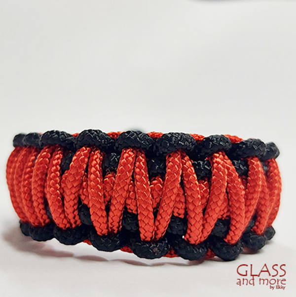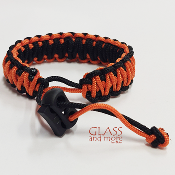 Paracord armband met oranje en zwart. Geknoopt zoals de MadMax 3 armbanden van Tom Hardy. Deze is met een zwarte koordstopper, raakt minder snel los.