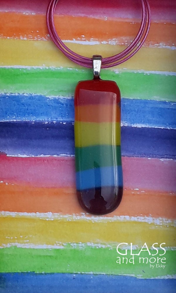 Een hanger in de regenboogkleuren, die ook gedragen kan worden. De basis van de hanger is hetzelfde maar ze kunnen er iets anders uit zien.