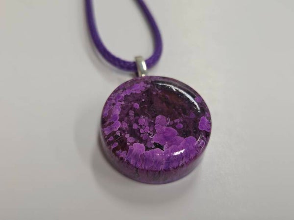 Een speelse epoxyhanger met gekleurd alcoholinkt. De hanger is gegoten in een lege strepsilblister.