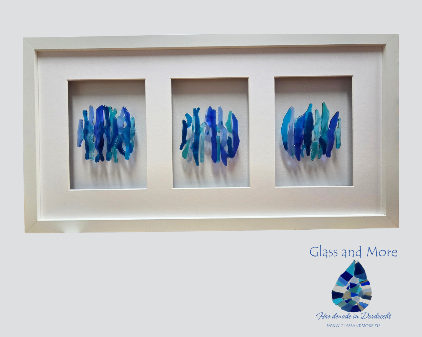 Something Blue bestaat uit drie kleine glaskunstwerkjes die samen één geheel vormen, naast elkaar in één lijst. Elk werkje is gemaakt van stroken glas in verschillende tinten blauw, die aan elkaar zijn gefused.