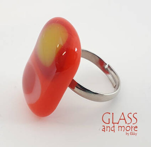 Rechthoekige ring van glas in geel, wit oranje en rood.